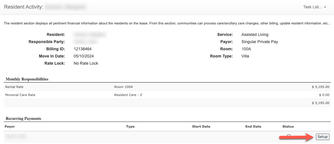 Step 2: Scroll down to the Resident Activity module. Beneath the resident's Monthly Responsibility grid, any active recurring payments will be listed.