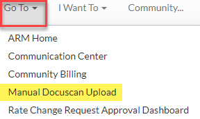 Step 1: Starting on the Resident Management home page, click the Go To menu, then select Manual DocuScan Upload.