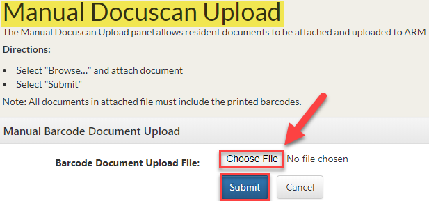 Step 2: On the Manual DocuScan Upload page, click Choose File to select a Barcode Document.