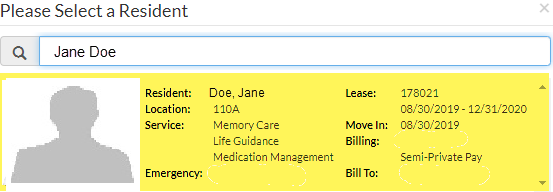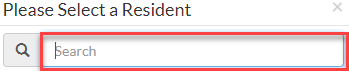 Step 5: In the Please Select a Resident window, search for and select a resident. Search by Name, Resident ID #, Room #.