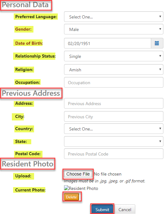 Step 10: Here you can enter/update information regarding the Resident, Current Address, Contact, Personal Data, Previous Address, and add/update Resident Photo.