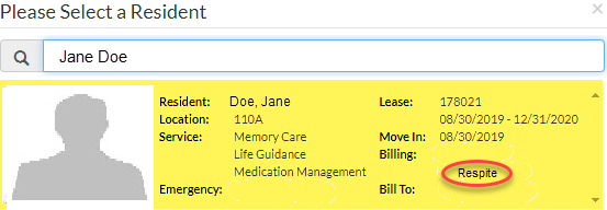 Step 5: In the Please Select a Resident window, search for and select a resident. Search by Name, Resident ID #, Room #.