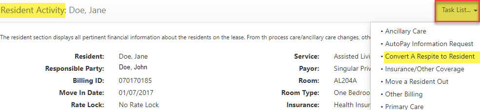 Step 8: Click the Task List menu, then select Convert A Respite to Resident.