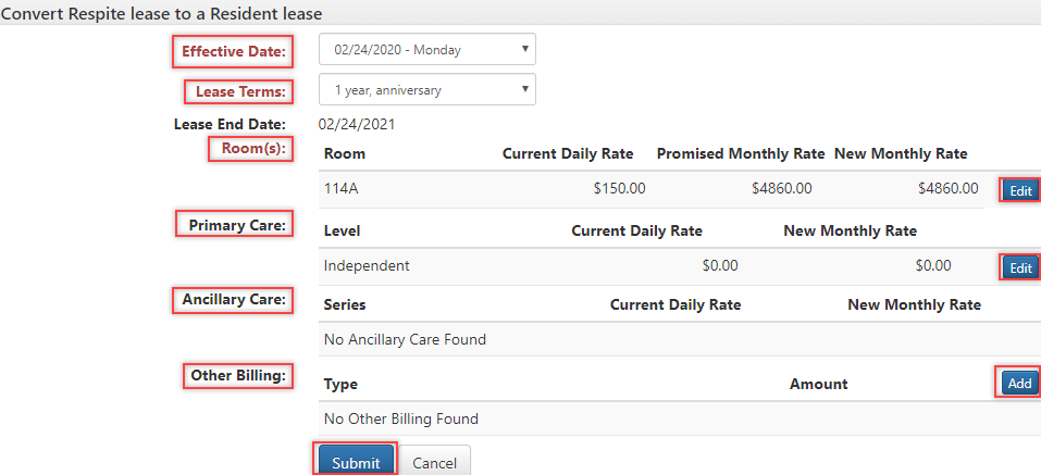 Step 9: On the Convert A Respite to Resident page, provide the Effective Date, Lease Terms, Room(s), Care Type, and Other Billing.