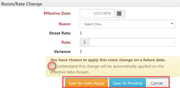 Step 9: In the Room/Rate Change window, update the Effective Date, Room, and Rate.