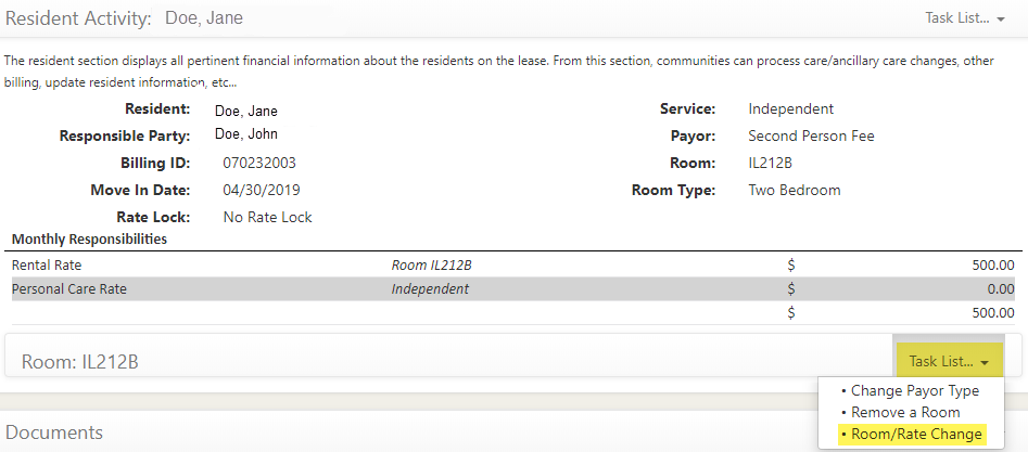 Step 7: On the resident’s Lease Management page, scroll down to the Room section of the page.