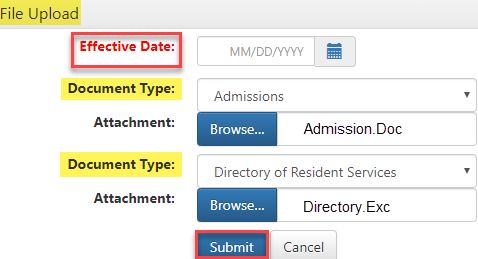 Step 9: In the File Upload window, provide the Effective Date and the Document Type.