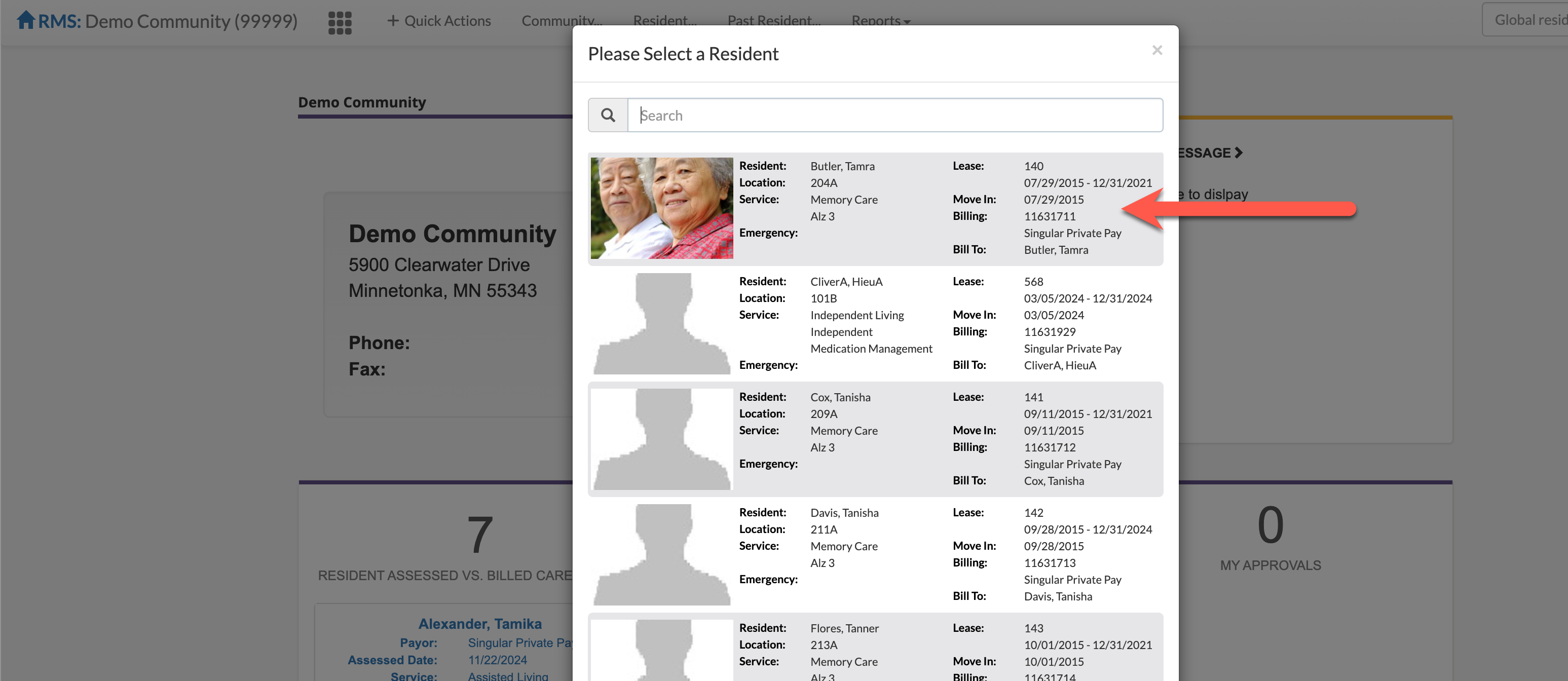 Step 1: Once logged into the Aline Leasing & Billing application, select the Resident dropdown menu and then select the desired resident.