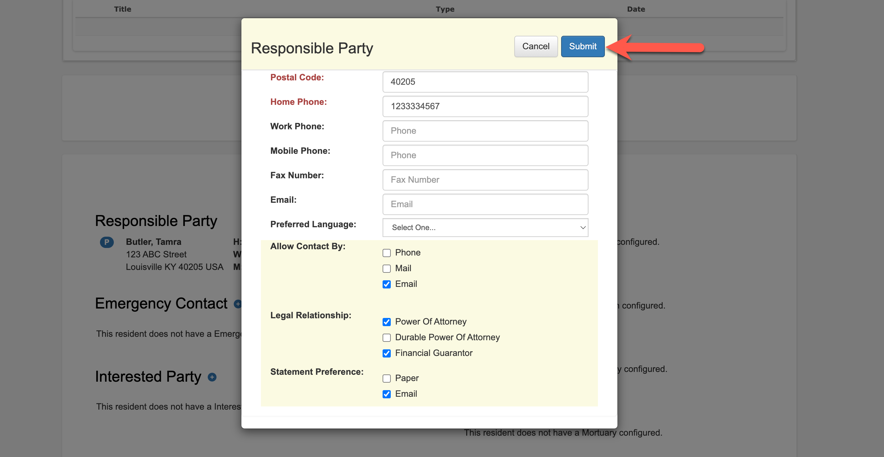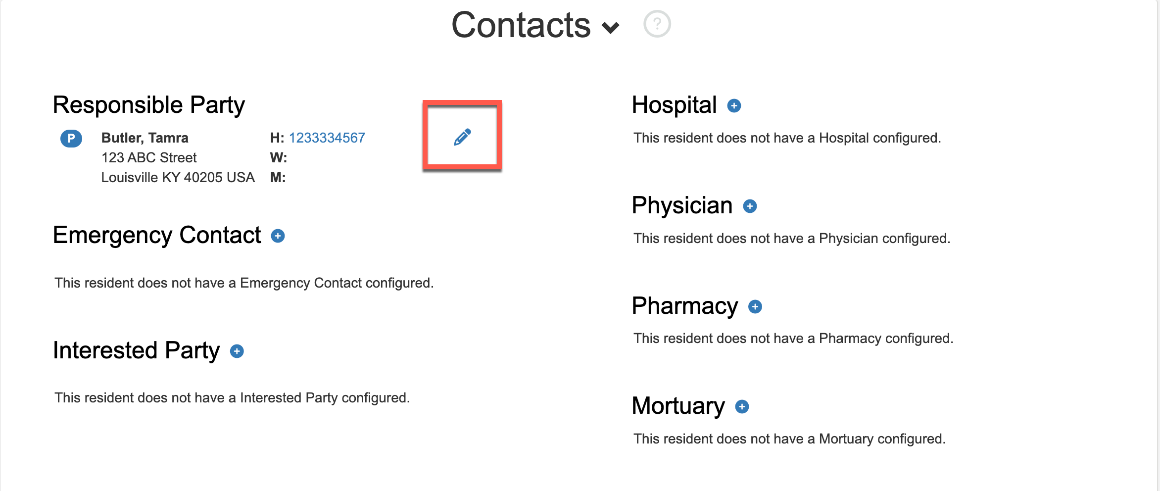 Step 2: On the resident profile, scroll down to Contacts. The Responsible Party, along with any Interested Party contacts that have been added as Payors, can have their Statement Delivery Preferences edited. Select the blue pencil icon to edit the contact.