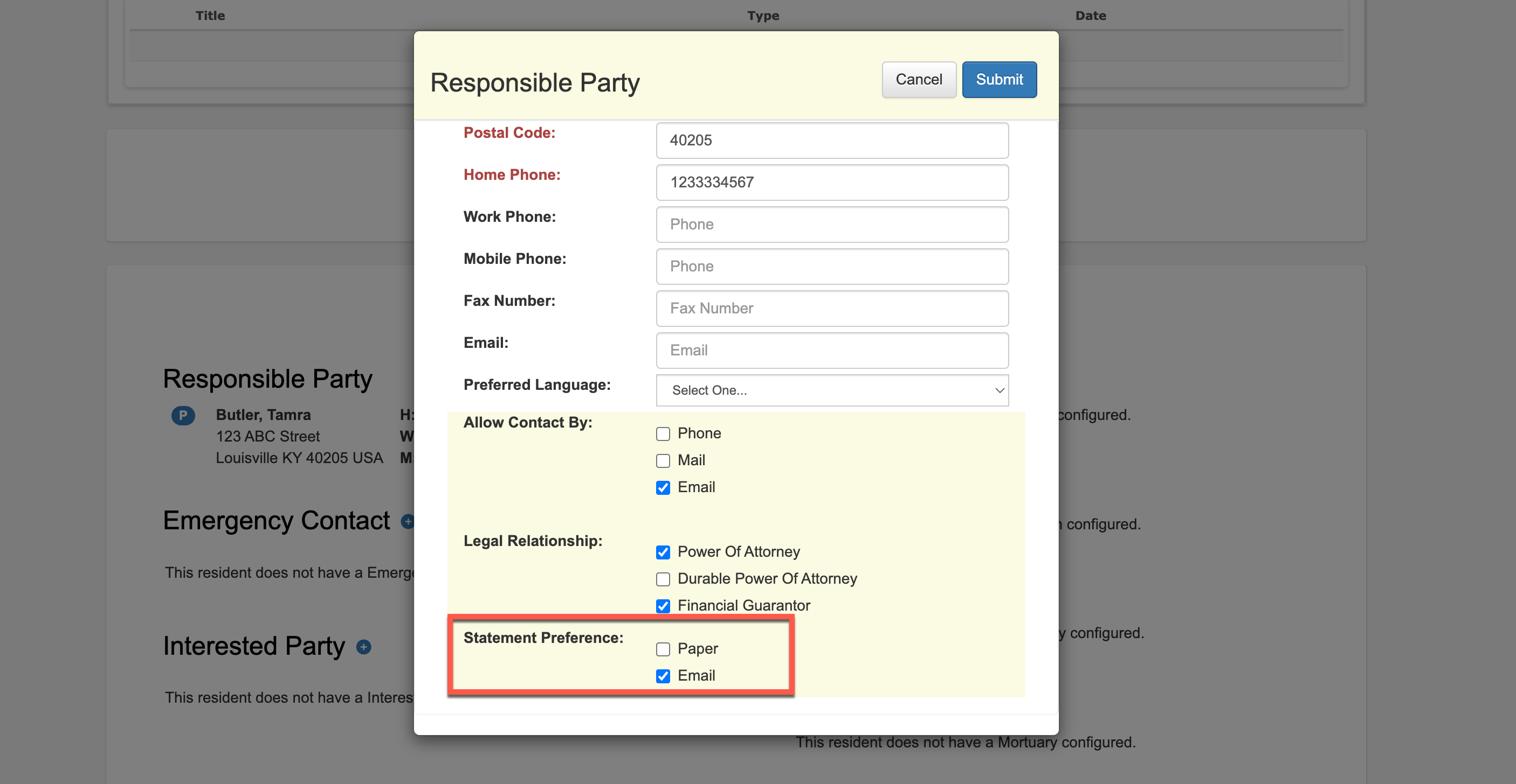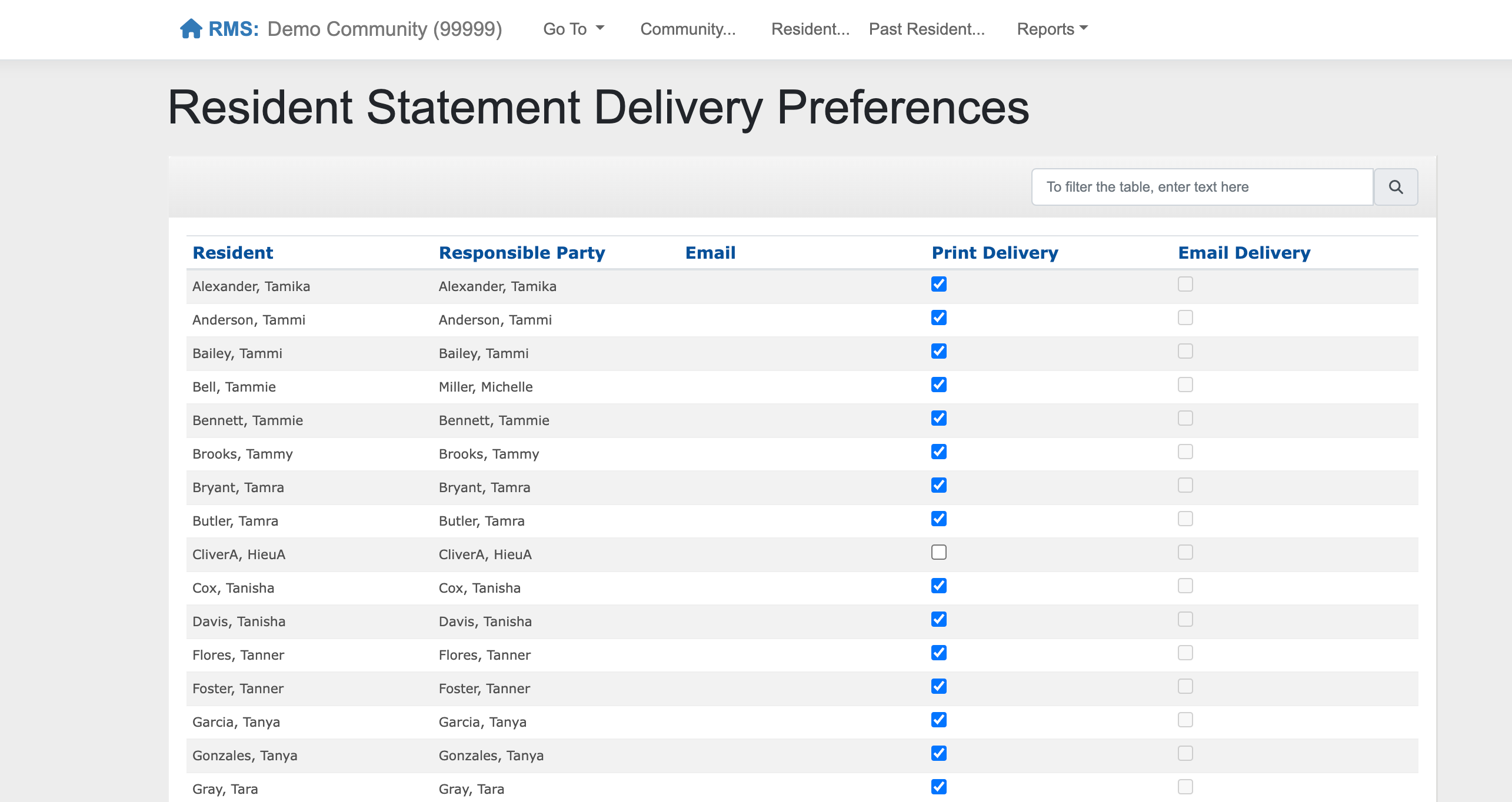 Step 2: A list of all active residents, their responsible parties, and their currently elected Statement Delivery Preferences will display. Edit any elections as necessary.