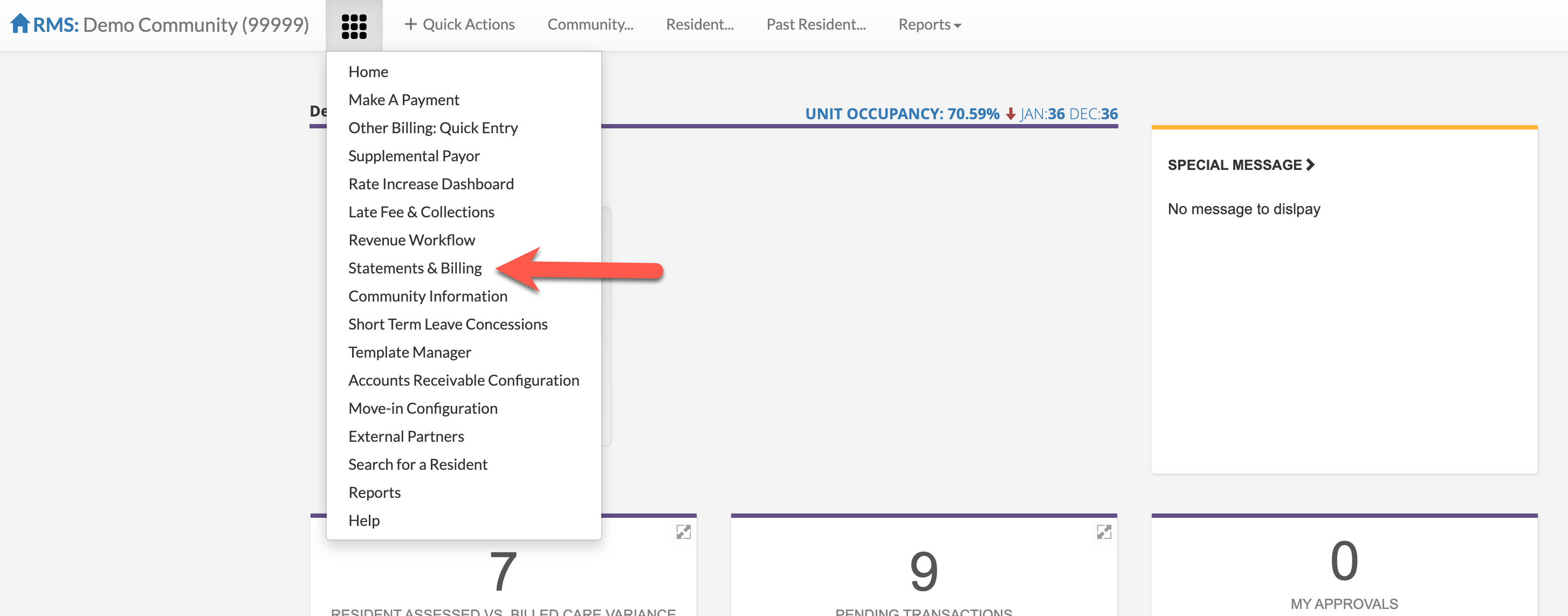 Step 1: Once logged into the Aline Leasing & Billing application, select the Waffle Menu and then Select Statements & Billing.