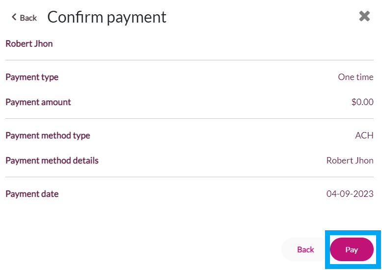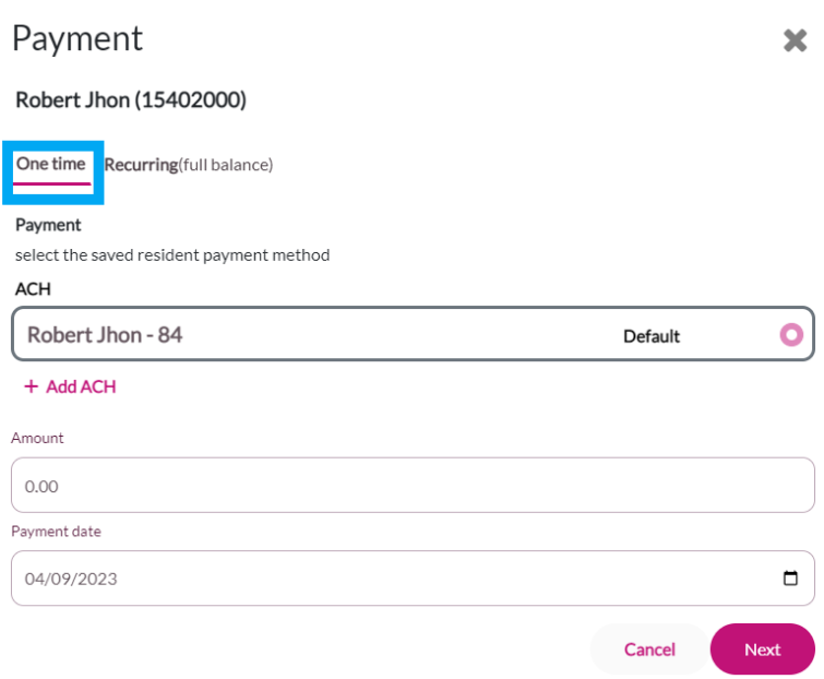 Step 3: Click “One time” payment and use default ACH or enter new ACH using “Add ACH”. Then click “Next”