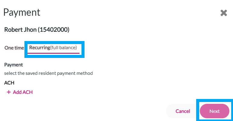 Step 3: Select “Recurring” on the payments page and use default ACH or enter new ACH using “Add ACH”. Then click “Next”