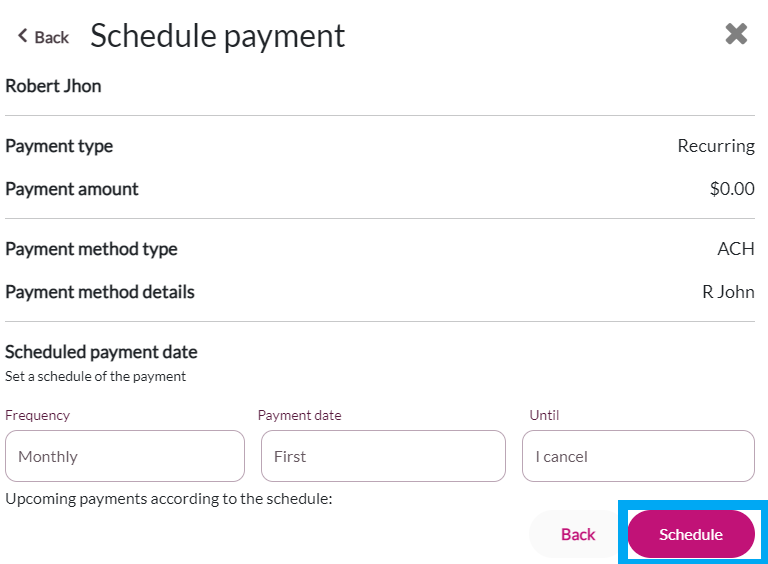 Step 4: Select” Frequency”, “Payment Date, and ‘Until” options in the dropdowns on the schedule payments page. Then click “Schedule”