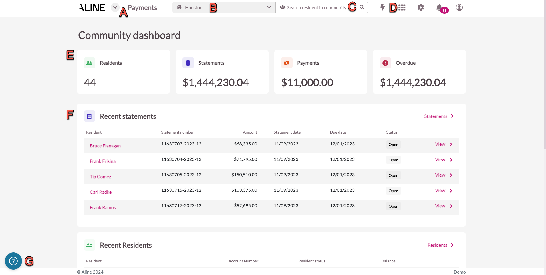 F: Recent Statements, Recent Residents, and Recent Payments displays information pertaining to statements, residents, and payments that have taken place most recently.