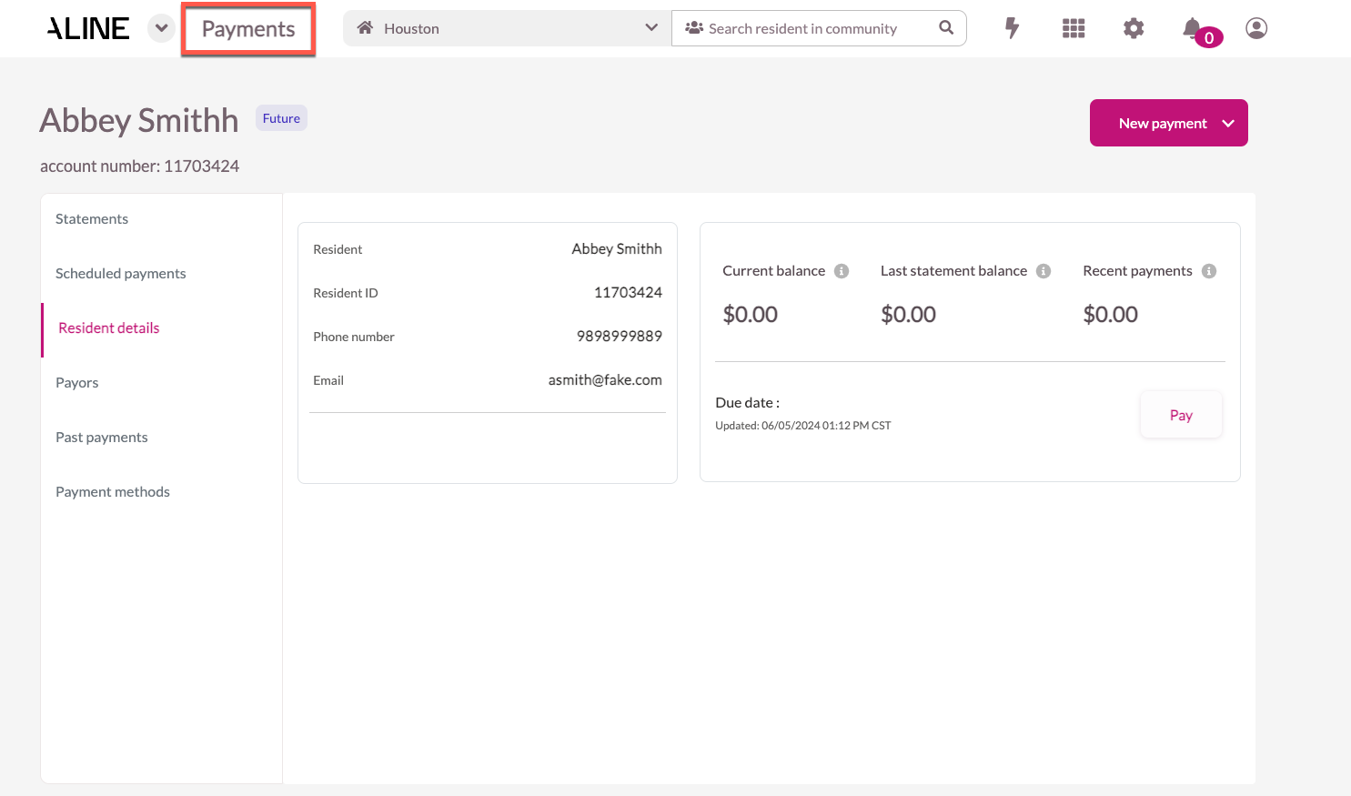 After selecting a resident profile, users will be redirected to that respective profile. The resident profile houses many functionalities including the ability to make a payment on a resident's / resident's responsible party's behalf. Selecting 'Payments' from the resident profile will return users to the Payments Dashboard.