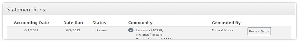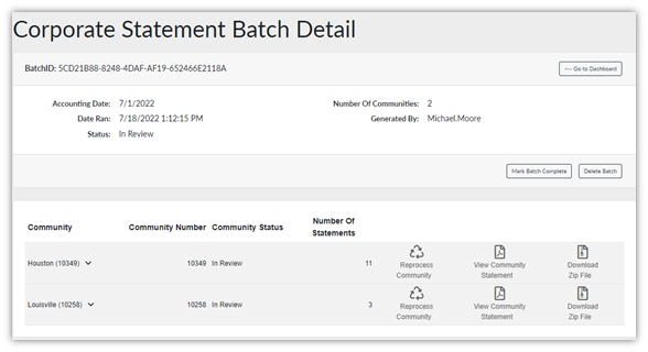 After the community has reviewed the statements, corrected any issues, and reprocessed the Statement Batch, the Statement Batch is ready to be marked complete. Ensure all modifications have been completed prior to marking the statement batch as complete. After marking the batch complete, no further modifications to the statement can be made. Any corrections must be issued for the following month.