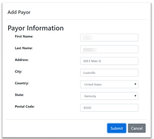 Step 3: After selecting the Add Payor button, the Add Payor Modal will appear. Enter Payor Information and select the Submit button.
