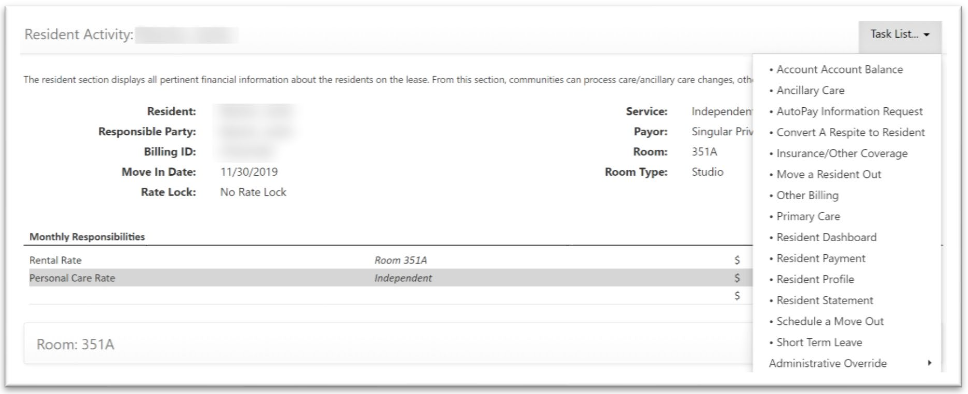 Step 1: Go to the Resident’s Lease Management page and select Resident Payment from the Resident Activity Task List.
