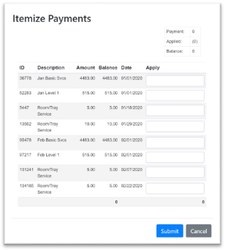 Step 3: After selecting the Itemize button, the Itemize Payment Modal will appear. Enter the amount on each item you want to make payment on and select Submit.