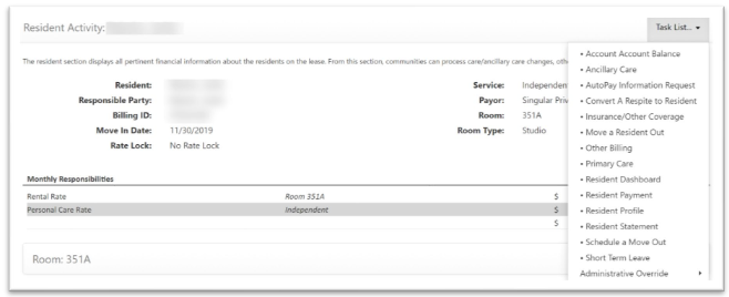 Step 1: Go to the Resident’s Lease Management page and select Resident Payment from the Resident Activity Task List.