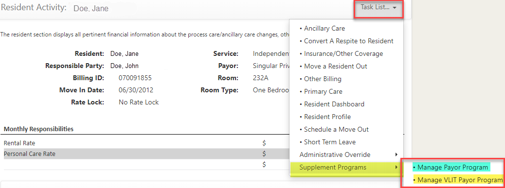 Step 8: Click the Task List menu, then select Supplemental Programs > Select either Manage Payor Program or Manage VLIT Payor Program.