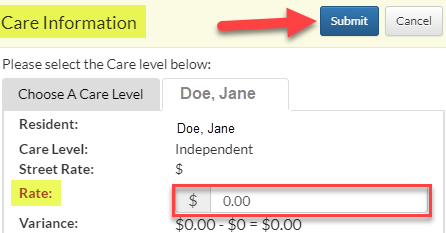 Note: If necessary, manually enter the Rate associated with the selected level of care.