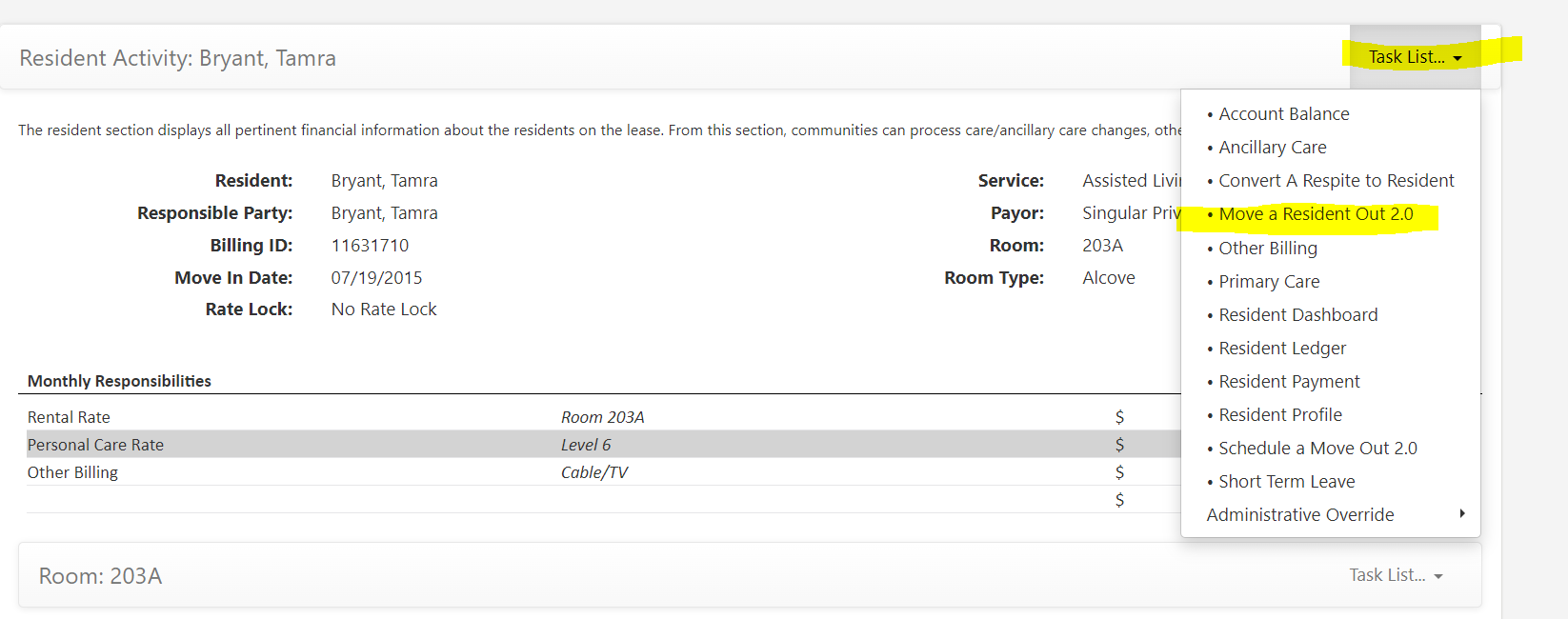 Step 3: Under the Resident Activity Task List Menu, select Move a Resident Out