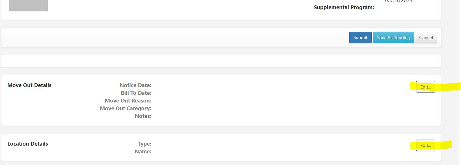 Step 4: Select edit in the move out details sections and fill in the following items under Move Out Details and Location Details:
