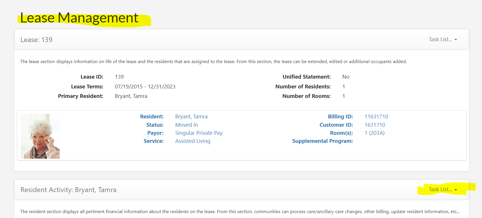 Step 2: From the resident profile page, select Task List Menu from the resident activity section