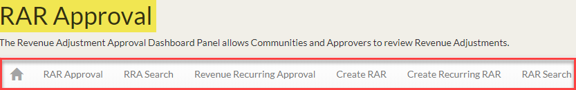 Step 6: The RAR Dashboard will default to RAR Approval; navigate to different modules by clicking on the top selection bar.