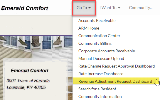 Step 4: Once on the Community page, click the Go To tab, then select Revenue Adjustment Request Dashboard.