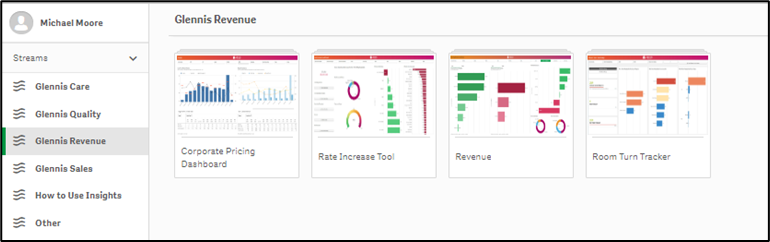To access the Aline Revenue Stream, select Aline Revenue from the left panel. Each Aline Insights Stream will contain multiple apps. As seen below, users have access to the following Revenue Apps: Corporate Pricing Dashboard, Rate Increase Tool, Revenue, and Room Turn Tracker.