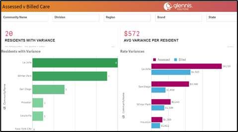 The second data set shows the average variance per resident along with a breakdown of rate variances within each community. The final data set displays a monthly reconciliation total – or the total amount of revenue to be expected were all communities to resolve their assessed vs billed care variances.