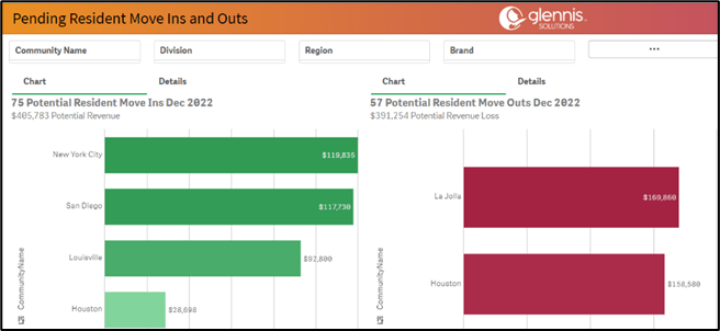 Here users can see which community in their portfolio has the most move ins and which communities have the most move outs in the current month. According to the data in the sample, the New York and San Diego communities have the most move ins, while La Jolla and Houston have the most potenial move outs.