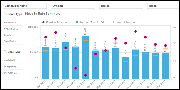 These sheets can potentially answer questions like which room types have the most or least move ins per month, and which care types have the most or least moves in per month. Move Out History displays the same data sets as Move In History, but only focuses on move outs and not move ins. The data from these sheets is fed directly from the sheet called Move in / out Detail, and allows users to view data related to each specific move in / move out.