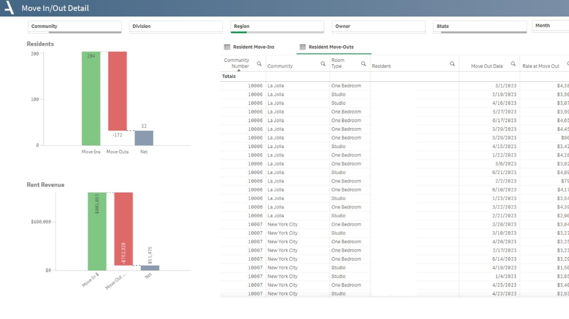 - Explore detailed tables showcasing individual move-in and move-out events, inclusive of community, room type, resident, date, and rates.