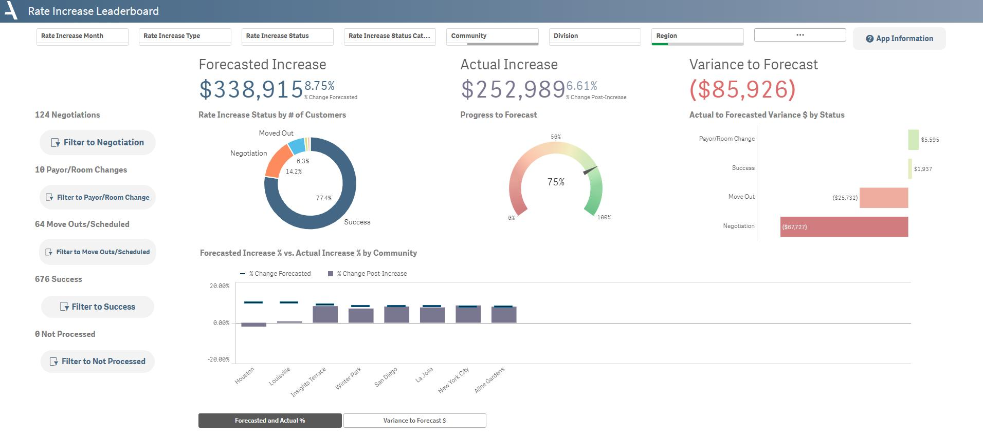 - Use the filter pane at the top to select the Rate Increase Month(s) you would like to view. View the gauge chart in the middle of the screen to see Progress to Forecast or use the Variance to Forecast KPI at the top of the screen to see how your community or portfolio is tracking. Use the chart on the far right to determine which status is creating the most Variance to Forecast. In this case, residents negotiating down from the forecasted rate is the most common cause of lost revenue.