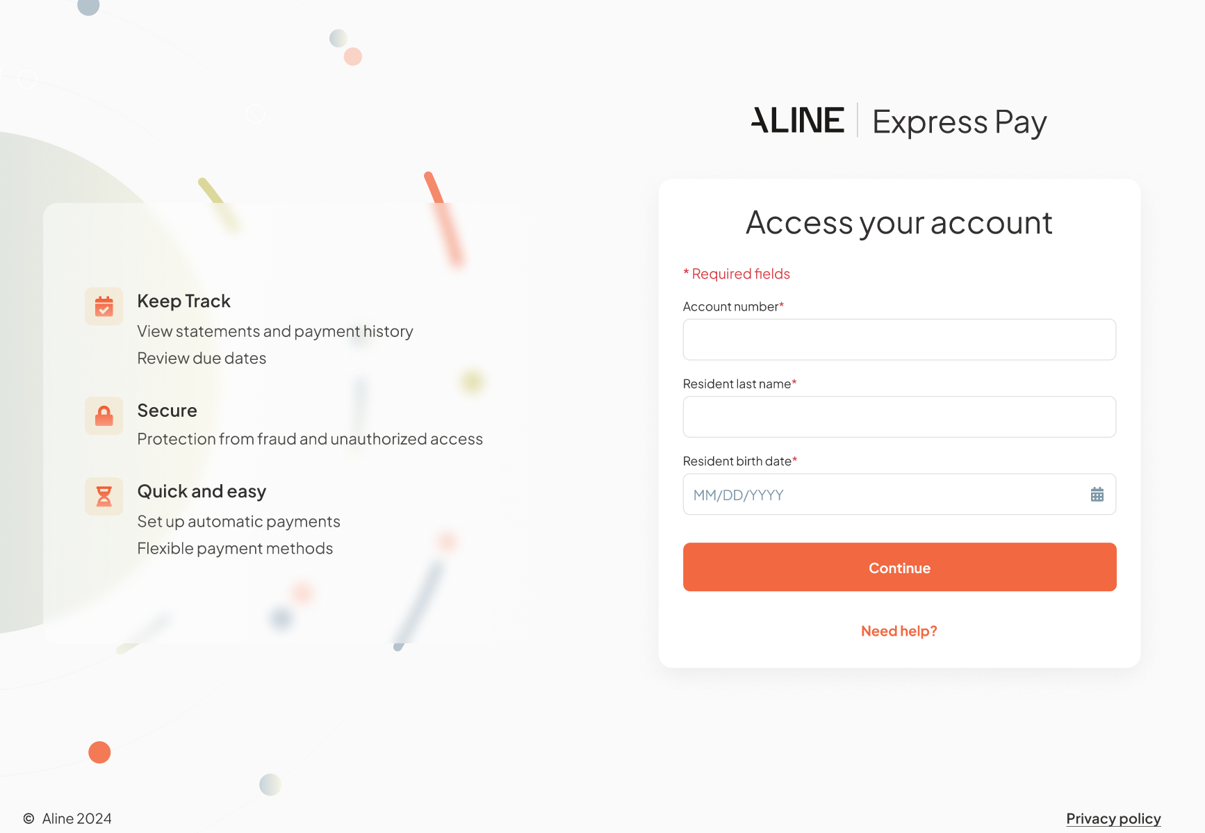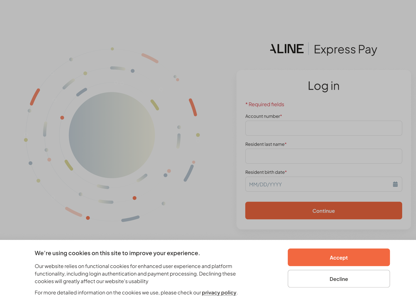 To access Express Pay, users will navigate to the Express Pay weblink provided by their Community Managers and accept the "Functional cookies." Following this, they can proceed to enter the Resident’s Account Number, Last Name, and Date of Birth.