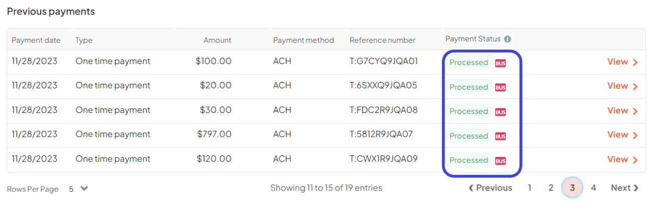 Transactions marked with a ‘BUS’ chip in the payment history signify payments processed by the community office.