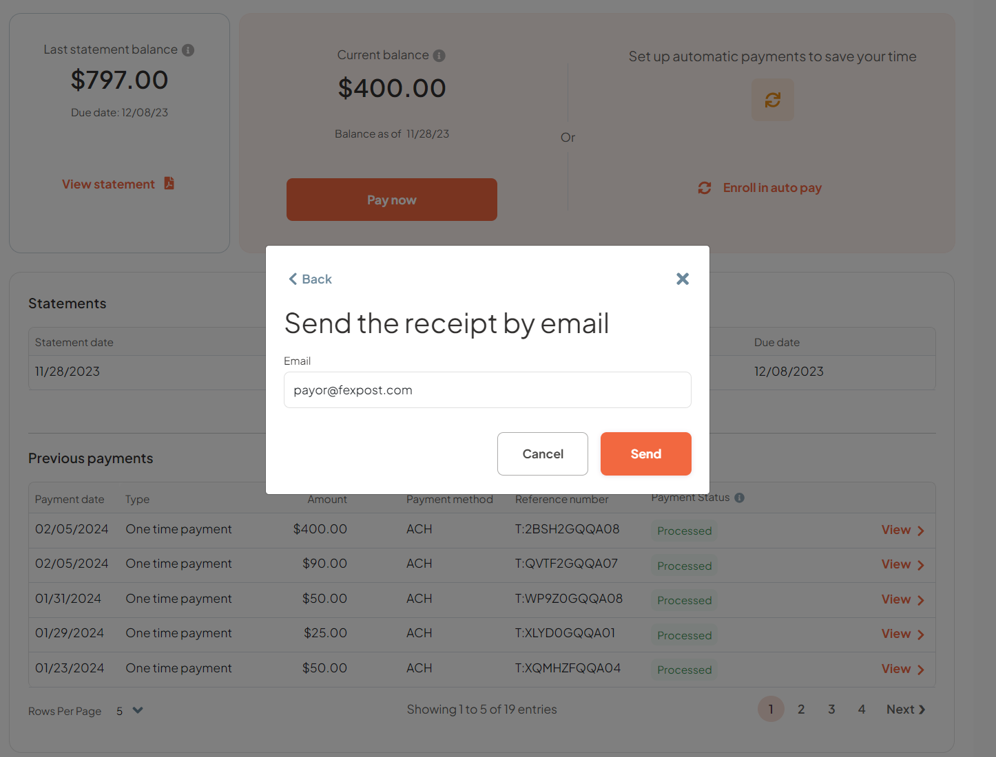 Step 2: Users can drill down to the details of each transaction by clicking on the view chevron, this also includes the option to send a copy of the transaction receipt to their email address.