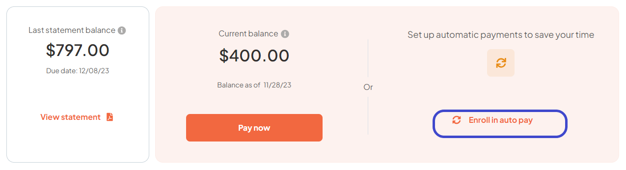 To set up recurring payments, users will navigate to the ‘Enroll is Auto Pay’ button on the dashboard.