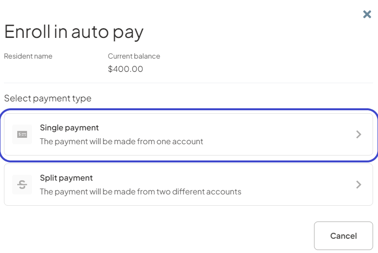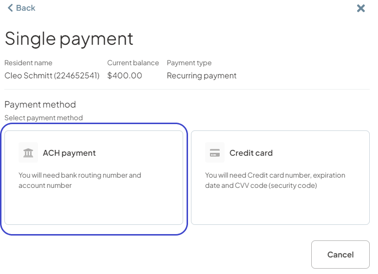 Users will click on the ‘Single payment‘ option and select ACH payments.