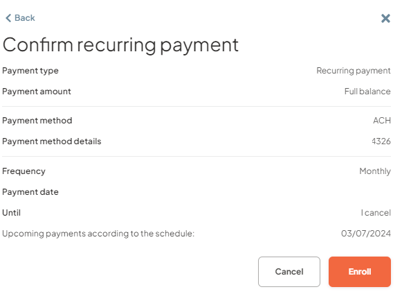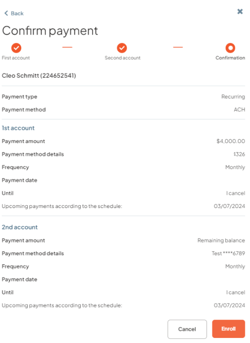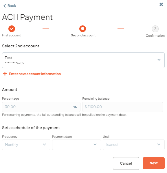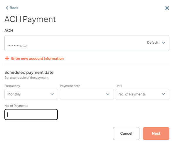 Users will then have the option to either use saved payment methods or provide new bank accounts. When users choose to schedule recurring payments using a new account by selecting ‘Enter new account information’ they will be required to provide ACH debit authorization.