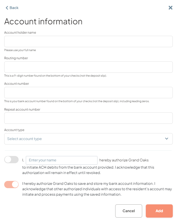 Users will provide authorization by checking the authorization toggle and entering their names. The saved toggle will be auto checked for users when scheduling recurring payments, as this would automatically give consent to the saving of their bank account information for future payment processing.