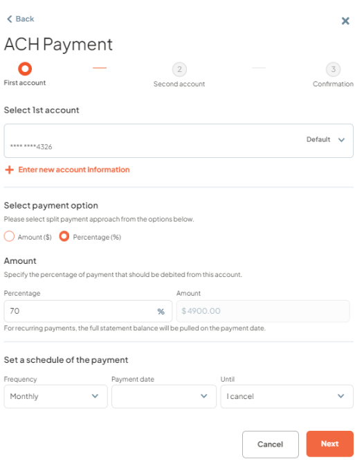 To schedule recurring split payments, the user will select recurring ‘Split payment ‘option and fill in the details for the first and second payment accounts, including either an Amount ($) or Percentage (%) split as applicable, as well as ‘Frequency’, ‘Payment Date’, and ‘Until’ options in the dropdowns on the schedule payments page. Elections made for the first account will be auto populated for the second account.