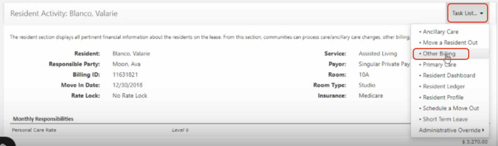 Step 1: Navigate to a resident profile and select Task List then Other Billing option in the drop down