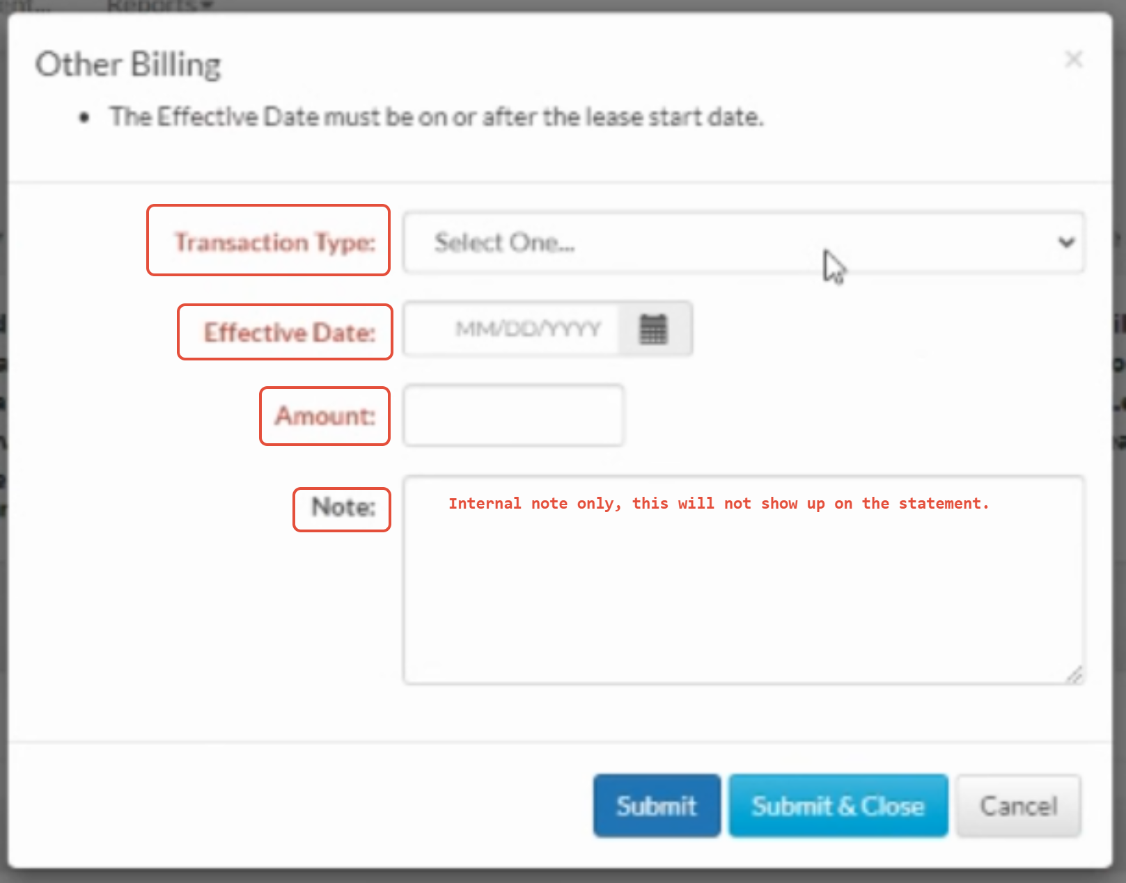 Step 3: A screen will populate to fill out the transaction type, effective date, amount and a note.