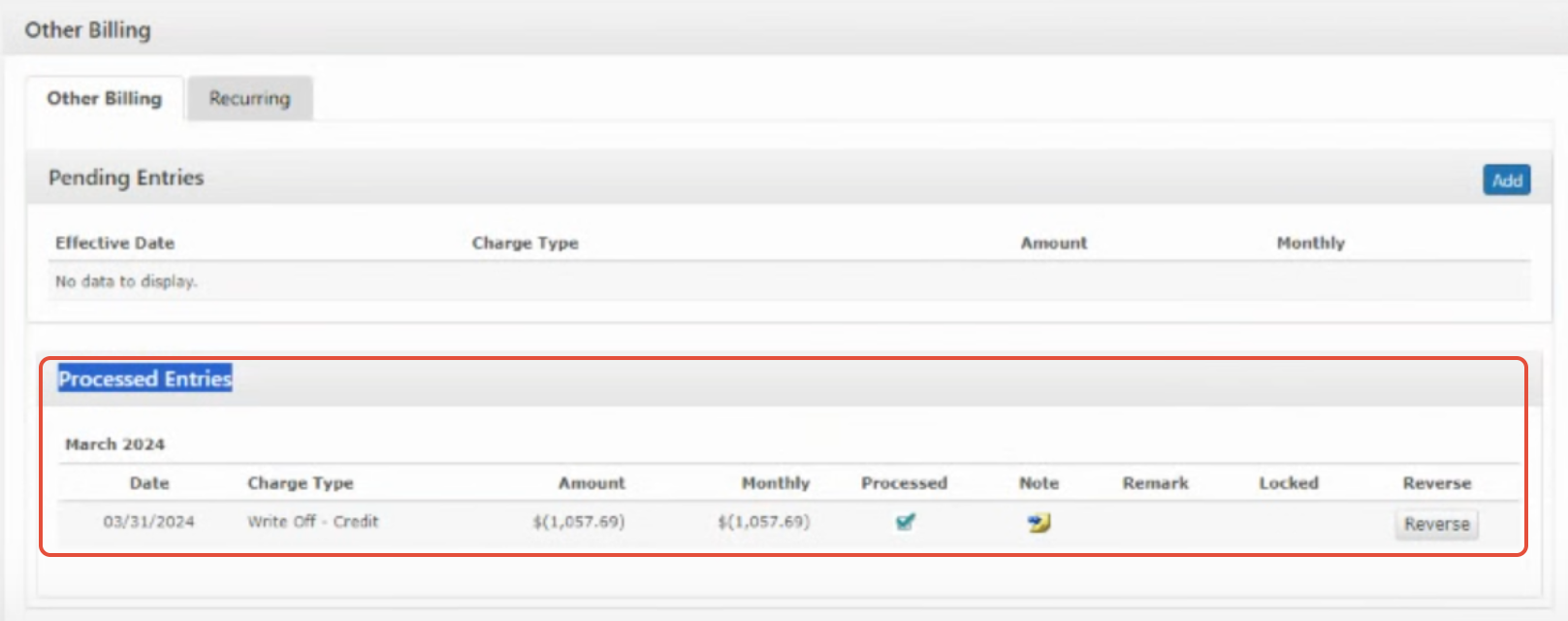 Step 5: Once completed, hit submit then you will see the write off under 'Processed Entries' section and in the residents ledger.