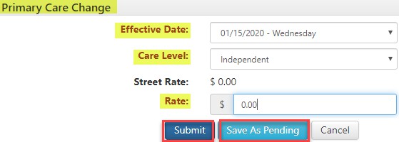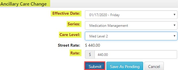 Step 4: Use the Ancillary Care window to update the Effective Date, Care Level, and Rate. Click Submit.